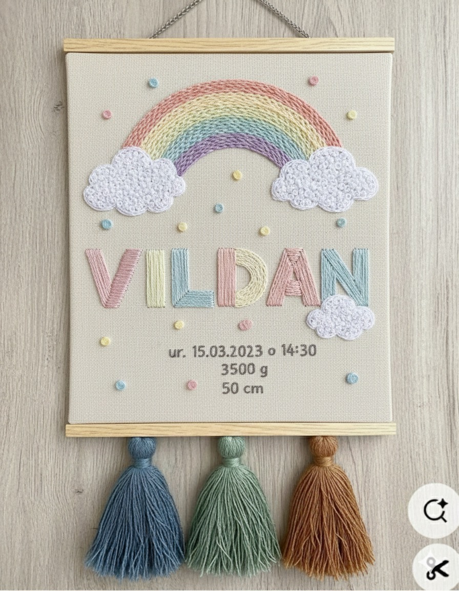 Bebeğinizin doğduğu o mucizevi anı ölümsüzleştirin. Yumuşak pastel tonlardaki gökkuşağı ve bulut detaylarıyla işlenen bu pano, sadece ismi değil; doğum tarihi, saati, kilosu ve boyu gibi en özel bilgileri de içeriyor. İskandinav tarzı dekorasyonlar için mükemmel bir tamamlayıcıdır.