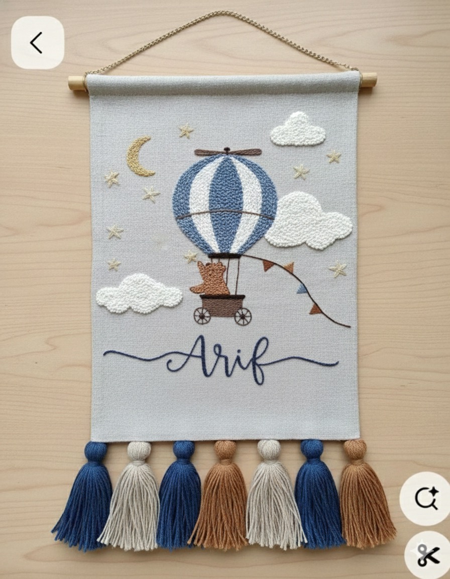 Masalsı bir atmosfer yaratmak isteyenler için… Sepetinde sevimli bir ayıcık taşıyan mavi balon figürü, etrafındaki altın sarısı yıldızlar ve hilal ile huzurlu bir uyku ortamı vadediyor. Nötr gri/bej zemin üzerine işlenen bu zarif tasarım, her renk oda mobilyasıyla uyum sağlar.