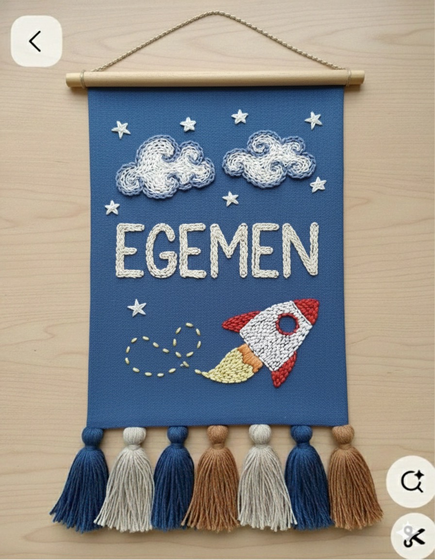 Geleceğin astronotları için tasarlandı! Koyu mavi zemin üzerine işlenen canlı renkteki roket, yıldızlar ve puf puf bulutlar, çocuğunuzun hayal dünyasını duvarlarına taşıyor. Erkek çocuk odaları için dinamik ve eğlenceli bir seçim. Alt kısımdaki gri, mavi ve kahve tonlarındaki püsküller tasarıma hareket katıyor.